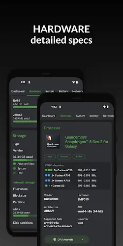 The core appeal of DevCheck lies in its ability to display CPU, GPU, RAM, and storage data intuitively and accurately to every millisecond. You can easily check detailed chip architecture, current clock speeds, and the temperature of each core to early detect overheating or throttling. The application provides full information about the model, manufacturer, Android version, kernel, and the latest security patches. For technical users, DevCheck support for Root and Shizuku is a major plus, allowing deep access to system permissions, checking BusyBox status, KNOX, and detailed parameters of both SIMs and mobile networks including IP and carrier info.