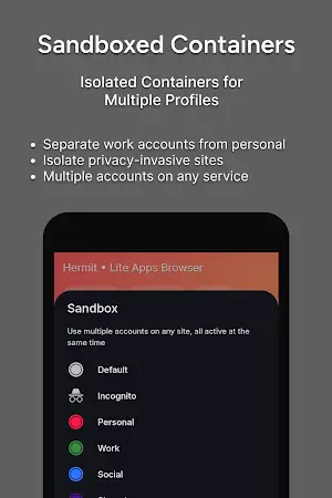 Each Lite App runs as an independent application with its own icon, interface, settings, and theme. You can pin websites, preload content for offline viewing, customize the layout, font, and color scheme, or enable Dark Mode for comfortable reading at night. With the Sandbox feature, Hermit allows you to log in to multiple accounts simultaneously, separate work from personal use, or maintain permanent incognito mode for websites requiring new accounts.