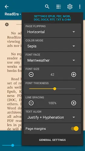 The true strength of ReadEra lies in its extensive compatibility with almost all popular formats today such as PDF, EPUB, MOBI, AZW3, and FB2 along with office files like DOCX, RTF, TXT, or ODT. You will never have to worry about installing additional supporting apps because ReadEra can directly open book files located in ZIP archives without manual extraction. Specifically, the app is deeply optimized for each format. For PDFs, you can auto-crop margins to make text larger or use double page spread for tablets. For Word files, the system automatically extracts the table of contents to help you navigate documents quickly with just a single tap.